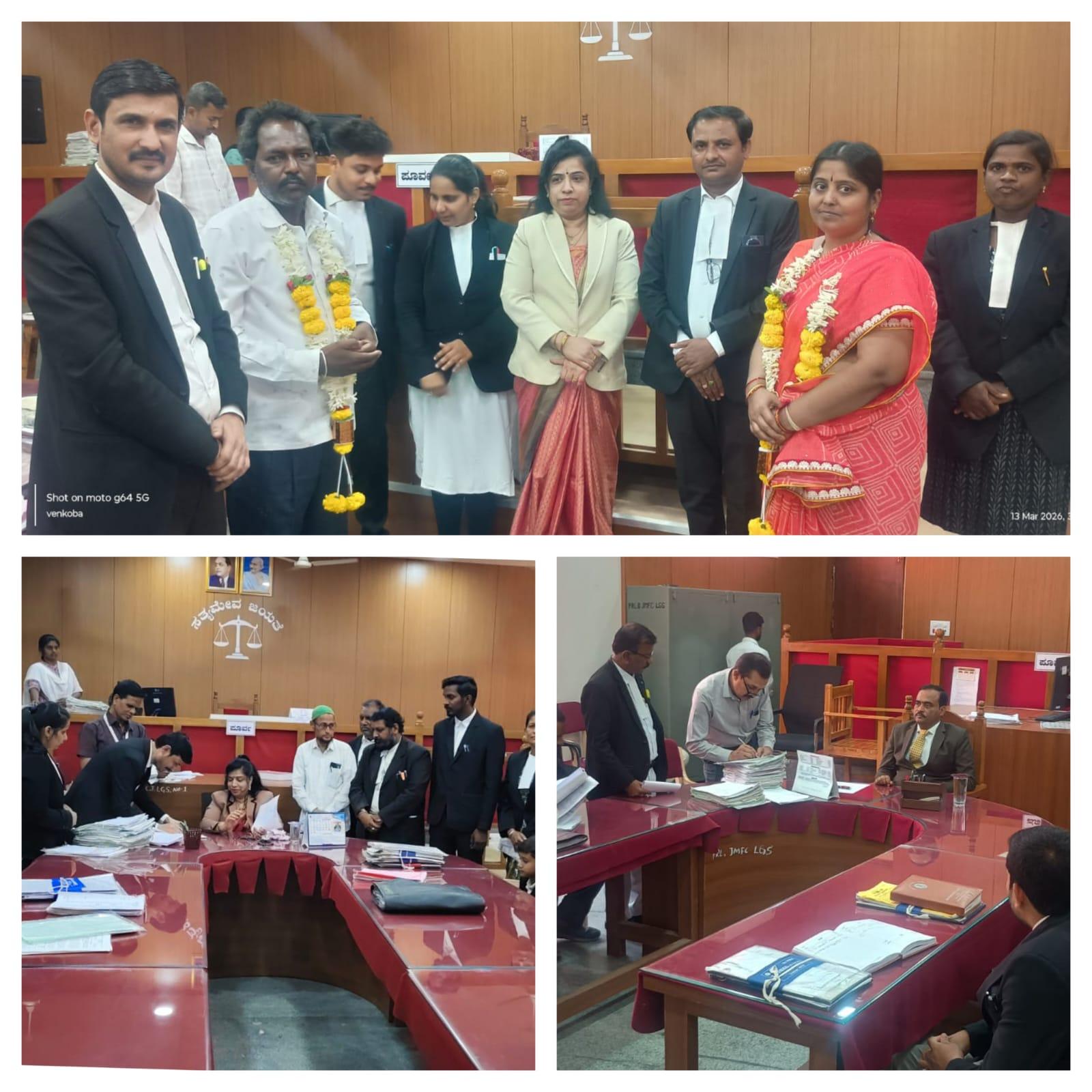 ಲಿಂಗಸಗೂರು : ಮಾ 15 .ಇಂದು ನಡೆದ ರಾಷ್ಟ್ರೀಯ ಲೋಕ ಅಧಾಲತ್ ನ ಹಿರಿಯ ಶ್ರೇಣಿ ನ್ಯಾಯಾಲಯದಲ್ಲಿ ಒಟ್ಟು ಬಾಕಿ ಇದ್ದ 2399 ಪ್ರಕರಣಗಳಲ್ಲಿ 712 ಪ್ರಕರಣಗಳು ರಾಜಿಯಾಗುವ ಮೂಲಕ ಇತ್ಯಾರ್ಥವಾಗಿವೆ ಇದರ ಒಟ್ಟು ಮೊತ್ತ 2,73,44,300/- ( ಎರಡು ಕೋಟಿ ಎಪ್ಪತ್ತಮೂರು ಲಕ್ಷ ನಲ್ವತ್ತ ನಾಲ್ಕು ಸಾವಿರದ ಮುನ್ನೂರು ) ರೂ ಆಗಿದ್ದು, ಅದರಲ್ಲಿ ಜೀವನಾಂಶ ಕೋರಿ ಅರ್ಜಿ ಸಲ್ಲಿಸಿದ್ದ ದಂಪತಿಗಳಿಗೆ ಹಿರಿಯ ಶ್ರೇಣಿ ನ್ಯಾಯಧೀಶರಾದ ಶ್ರೀಮತಿ ಹುಂಡಿ ಮಂಜುಳಾ ಶಿವಪ್ಪ ಇವರು ಮನಹೊಲಿಸಿ ಗಂಡ ಹೆಂಡತಿಯನ್ನು ಒಗ್ಗೂಡಿಸಿದರು . ಅಂಬಣ್ಣ ಕೆ. ಪ್ರಧಾನ ಸಿವಿಲ್ ನ್ಯಾಯಧೀಶರು ಇವರು ಪ್ರಧಾನ ಸಿವಿಲ್ ನ್ಯಾಯಾಲದಲ್ಲಿ ಒಟ್ಟು ಬಾಕಿ ಇದ್ದ 2306 ಪ್ರಕರಣಗಳಲ್ಲಿ 874 ಪ್ರಕರಣಗಳು ರಾಜಿಯಾಗುವ ಮೂಲಕ ಇತ್ಯಾರ್ಥವಾಗಿವೆ ಇದರ ಒಟ್ಟು ಮೊತ್ತ 95,82,551/- ( ತೊಂಬತ್ತ ಐದು ಲಕ್ಷದ ಎಂಬತ್ತ ಎರಡು ಸಾವಿರದ ಐದುನೂರ ಐವತೊಂದು ) ರೂ ಆಗಿದ್ದು ಮತ್ತು ಹೆಚ್ಚುವರಿ ಸಿವಿಲ್ ನ್ಯಾಯಾಲದಲ್ಲಿ ಒಟ್ಟು ಬಾಕಿ ಇದ್ದ 1077 ಪ್ರಕರಣಗಳಲ್ಲಿ 682 ಪ್ರಕರಣಗಳು ರಾಜಿಯಾಗುವ ಮೂಲಕ ಇತ್ಯಾರ್ಥವಾಗಿವೆ ಇದರ ಒಟ್ಟು ಮೊತ್ತ 3,22,183/- ( ಮೂರು ಲಕ್ಷದ ಇಪ್ಪತ್ತೆರಡು ಸಾವಿರದ ನೂರಾ ಎಂಬತ್ತಾ ಮೂರು ) ರೂ ಆಗಿದ್ದು. ಇಂದು ಒಟ್ಟು ಲಿಂಗಸಗೂರು ನ್ಯಾಯಾಲಯದಲ್ಲಿ 2268 ಪ್ರಕರಣಗಳು ರಾಜಿಯಾಗಿವೆ. ಇದರ ಒಟ್ಟು ಮೊತ್ತ 3,72,49,034/- ( ಮೂರು ಕೋಟಿ ಎಪ್ಪತ್ತ ಎರಡು ಲಕ್ಷದ ನಲವತ್ತ ಒಂಬತ್ತು ಸಾವಿರದ ಮೂವತ್ತ ನಾಲ್ಕು ) ರೂ ಆಗಿದ್ದು. ಮತ್ತು ಒಟ್ಟು ಬಾಕಿ ವ್ಯಾಜ್ಯಪೂರ್ವ ಪ್ರಕರಣಗಳು 6000 ರಲ್ಲಿ 4950 ಪ್ರಕರಣಗಳು ರಾಜಿಯಾಗುವ ಮೂಲಕ ಇತ್ಯಾರ್ಥವಾಗಿವೆ ಇದರ ಒಟ್ಟು ಮೊತ್ತ 29,65,159/- ( ಇಪ್ಪತ್ತ ಒಂಬತ್ತು ಲಕ್ಷದ ಅರವತ್ತ ಐದು ಸಾವಿರದ ಒಂದು ನೂರಾ ಐವತ್ತಾ ಒಂಬತ್ತು ) ರೂ ಆಗಿದೆ. ಈ ಸಂದರ್ಭದಲ್ಲಿ ವಕೀಲರ ಸಂಘದ ಅಧ್ಯಕ್ಷ