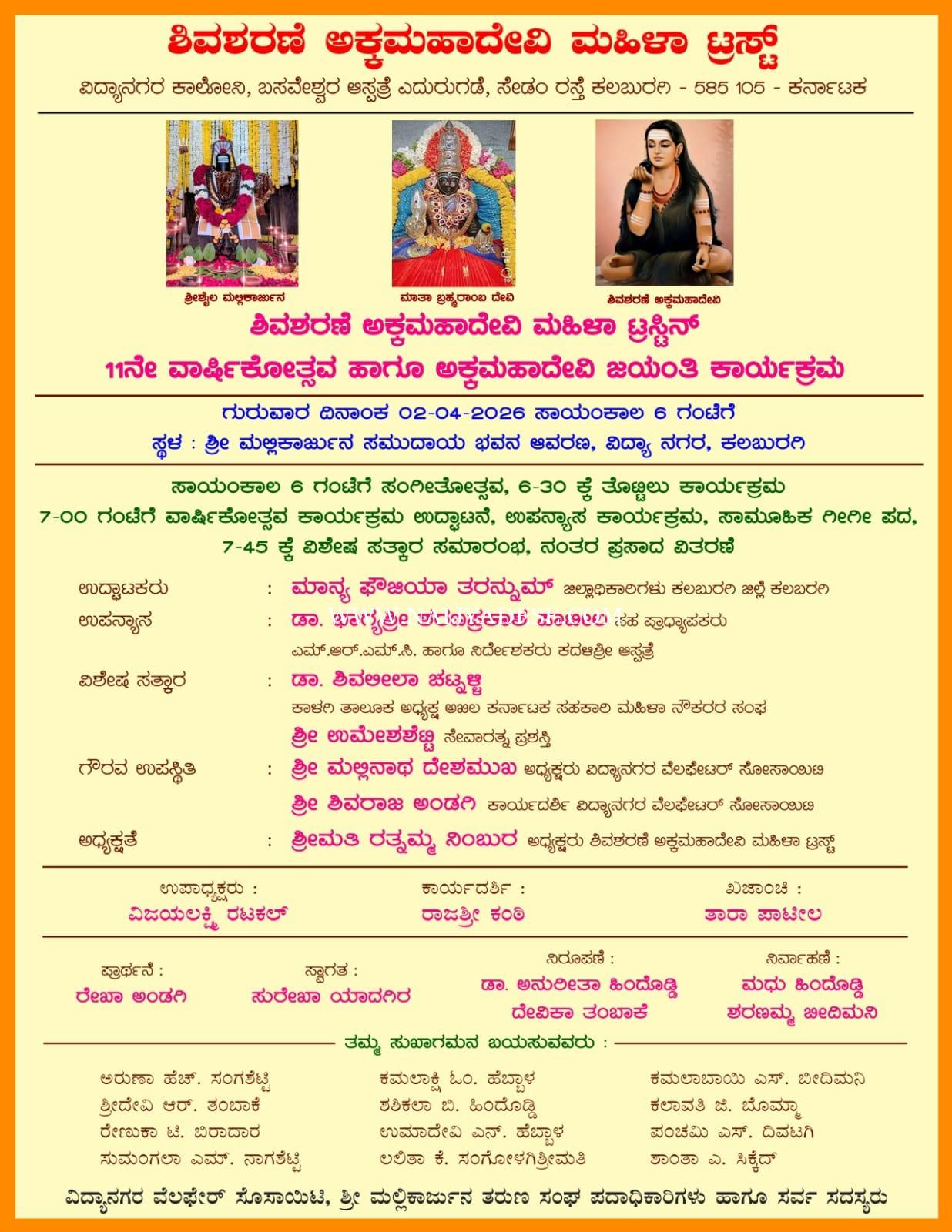 ಸಾಯಂಕಾಲ 6:೦೦ ಗಂಟೆಗೆ ಸಂಗೀತಾ ಕಾರ್ಯಕ್ರಮ, 6:30 ಗಂಟೆಗೆ ಅಕ್ಕಮಹಾದೇವಿ ತೊಟ್ಟಿಲು ಕಾರ್ಯಕ್ರಮ, 7:೦೦ ಗಂಟೆಗೆ ಟ್ರಸ್ಟಿನ್ ವಾರ್ಷಿಕೋತ್ಸವ ಸಮಾರಂಭದ ಉಧ್ಘಾಟನೆ ಕಲಬುರಗಿ ಜಿಲ್ಲೆಯ ಜಿಲ್ಲಾಧಿಕಾರಿಗಳಾದ, ಮಾನ್ಯ ಫೌಜಿಯಾ ತರನ್ನುಮ್ಮ ನೇರವೇರಿಸಲಿದ್ದಾರೆ. ಎಮ್.ಆರ್.ಎಮ್.ಸಿ ಕಾಲೇಜಿನ ಸಹ-ಪ್ರಾಧ್ಯಾಪಕರು, ಹಾಗೂ ಕದಳಿ ಶ್ರೀ ಆಸ್ಪತ್ರೆಯ ನಿರ್ದೇಶಕರಾದ ಡಾ. ಭಾಗ್ಯಶ್ರೀ ಶರಣಪ್ರಕಾಶ ಪಾಟೀಲ ಉಪನ್ಯಾಸ ನೀಡಲಿದ್ದಾರೆ. ಇದೇ ಸಂದರ್ಭದಲ್ಲಿ ಡಾ.ಶಿವಲೀಲಾ ಚಟ್ನಳ್ಳಿ ಹಾಗೂ ಉಮೇಶ ಶೆಟ್ಟಿ ಅವರಿಗೆ ವಿಶೇಷ ಸತ್ಕಾರ ಸಮಾರಂಭ ಜರುಗುವುದು. ವಿದ್ಯಾನಗರ ವೇಲ್ಫೇರ್ ಸೋಸೈಟಿ ಅಧ್ಯಕ್ಷ ಮಲ್ಲಿನಾಥ ದೇಶಮುಖ, ಕಾರ್ಯದರ್ಶಿ ಶಿವರಾಜ ಅಂಡಗಿ, ಅತಿಥಿಗಳಾಗಿ ಆಗಮಿಸಲಿದ್ದಾರೆ. ಟ್ರಸ್ಟಿನ್ ಅಧ್ಯಕ್ಷ ಶ್ರೀಮತಿ ರತ್ನಮ್ಮ ನಿಂಬೂರ ಕಾರ್ಯಕ್ರಮದ ಅಧ್ಯಕ್ಷತೆ ವಹಿಸಲಿದ್ದಾರೆ. ಟ್ರಸ್ಟಿನ ಪದಾಧಿಕಾರಿಗಳಾದ ವಿಜಯಲಕ್ಷ್ಮಿ ರಟಕಲ್, ರಾಜೇಶ್ರೀ ಕಂಠಿ, ತಾರಾ ಪಾಟೀಲ, ಮಧು ಹಿಂದೊಡ್ಡಿ, ಹಾಗೂ ಇತರರು ಉಪಸ್ಥಿತರಿರುವರು.