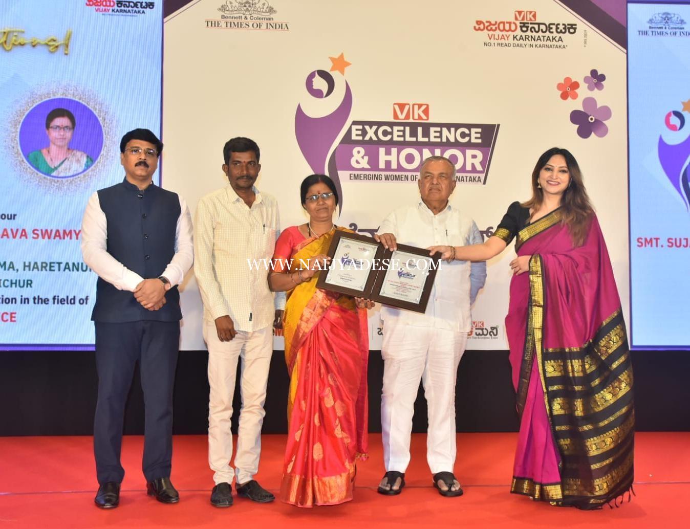 ಸಿಂಧನೂರು : ಬೆಂಗಳೂರು- ರಾಜಧಾನಿಯ ಪ್ರತಿಷ್ಠಿತ ‘ದಿ ಚಾನ್ಸೆಲರ್ ಪೆವಿಲಿಯನ್ ಇಂಟರ್ ನ್ಯಾಷನಲ್’ ಹೋಟೆಲ್ನಲ್ಲಿ ಇಂದು ಹಮ್ಮಿಕೊಳ್ಳಲಾಗಿದ್ದ ವಿಜಯ ಕರ್ನಾಟಕ ಕನ್ನಡ ದಿನಪತ್ರಿಕೆಯ ವಿಶೇಷ ಸಮಾರಂಭದಲ್ಲಿ, ಸಿಂಧನೂರಿನ ಕರುಣೆಯ ಕಾರುಣ್ಯ ಆಶ್ರಮದ ಪ್ರಮುಖ ಸೇವಾಕರ್ತರಾದ ಶ್ರೀಮತಿ ಸುಜಾತ ಚನ್ನಬಸವ ಸ್ವಾಮಿ ಹಿರೇಮಠ (ಹರೇಟನೂರು) ಅವರಿಗೆ “ಎಕ್ಸ್ ಲೆಂಟ್ ಹಾನರ್ ಅಂತರಾಷ್ಟ್ರೀಯ ಮಹಿಳಾ ಸಾಧಕಿ” ಎನ್ನುವ ಶ್ರೇಷ್ಠ ಪ್ರಶಸ್ತಿಯಾನ್ನು ಕರ್ನಾಟಕ ಸರ್ಕಾರದ ಸಚಿವರಾದ ರಾಮಲಿಂಗಾರೆಡ್ಡಿ ಹಾಗೂ ಖ್ಯಾತ ನಟಿ ಮೇಘನಾ ಗಾಂವ್ಕರ್ ಇವರುಗಳ ಸಮಕ್ಷಮದಲ್ಲಿ ಗೌರವ ಪೂರ್ವಕವಾಗಿ ಪ್ರಶಸ್ತಿಯನ್ನು ವಿತರಿಸಿ ಗೌರವಿಸಲಾಯಿತು.
