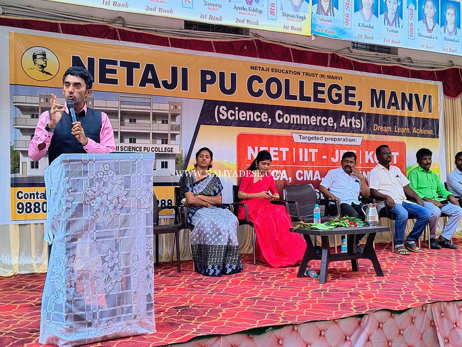 ಮಾನ್ವಿ : ಮಾನ್ವಿ ತಾಲೂಕಿನ ಪಾಲಕರ ಮನದಲ್ಲಿ ವಿಶಿಷ್ಠ ಸ್ಥಾನ ಪಡೆದ ನೇತಾಜಿ ಶಿಕ್ಷಣ ಸಂಸ್ಥೆ ವಿದ್ಯಾರ್ಥಿಗಳಿಗೆ ಅತ್ಯುತ್ತಮ ಶಿಕ್ಷಣ ನೀಡುವುದರ ಜೊತೆಗೆ ಅವರ ಭವಿಷ್ಯಕ್ಕೆ ಉತ್ತಮ ಮಾರ್ಗದರ್ಶನ ನೀಡಿ ಸಾರ್ಥಕ ಕೆಲಸ ಮಾಡುತ್ತಿದೆ ಎಂದು ರಾಜ್ಯ ಸಂಪನ್ಮೂಲ ವ್ಯಕ್ತಿ ಗಿರಿಧರ ಪೂಜಾರ್ ಹೇಳಿದರು. ಅವರು ಪಟ್ಟಣದ ನೇತಾಜಿ ಶಿಕ್ಷಣ ಸಂಸ್ಥೆಯ ನೇತಾಜಿ ಸೈನ್ಸ್ ಕಾಲೇಜು ವತಿಯಿಂದ ಹಮ್ಮಿಕೊಂಡಿದ್ದ 10ನೇ ತರಗತಿ ವಿದ್ಯಾರ್ಥಿಗಳ ಟ್ಯಾಲೆಂಟ್ ಹಂಟ್ ಪರೀಕ್ಷೆಯ ಉದ್ಘಾಟನೆ ಮಾಡಿ ಮಾತನಾಡಿದರು.