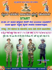 ಸೈನಿಕ ಅಕಾಡೆಮಿ ದೇವದುರ್ಗದಿಂದ ಅಗ್ನಿವೀರ, ಆರ್ಮಿ, ಪೋಲೀಸ್ ಹಾಗೂ ಪಿ.ಎಸ್.ಐ. ಹುದ್ದೆಗೆ ನೇಮಕ ಬಯಸುವ ಯುವಕರಿಗೆ ಉಚಿತ ತರಬೇತಿ ನೀಡುವ ಶಿಬಿರವನ್ನು ಆಯೋಜಿಸಲಾಗುತ್ತಿದೆ ಎಂದು ಸೈನಿಕ ಅಕಾಡೆಮಿಯ ಅಧ್ಯಕ್ಷ ಭಾನು ಪ್ರಕಾಶ ಖೇಣೇದ್ ತಿಳಿಸಿದರು. ಪಟ್ಟಣದಲ್ಲಿ ಗುರುವಾರ ಸುದ್ದಿಗಾರರೊಂದಿಗೆ ಮಾತನಾಡಿ, ಸೈನಿಕ ಅಕಾಡೆಮಿಯಿಂದ ದೇವದುರ್ಗದಲ್ಲಿ ಕಳೆದ 6 ವರ್ಷಗಳಿಂದ ಉಚಿತ ತರಬೇತಿ ನೀಡುತ್ತಿದ್ದು, ಸುಮಾರು 20 ಯುವಕರು ಸೈನಿಕರಾಗಿ ಆಯ್ಕೆಗೊಂಡಿದ್ದಾರೆ. ಸೈನಿಕರಾಗಲು ಬಯಸುವ ಯುವಕರಿಗೆ ಸರಕಾರಿ ಬಾಲಕಿಯರ ಪ್ರೌಢ ಶಾಲಾ ಆವರಣದಲ್ಲಿ ( ಬಸ್ ನಿಲ್ದಾಣದ ಹತ್ತಿರ) ಏ.5 ರಂದು ದೈಹಿಕ ಮತ್ತು ಪ್ರವೇಶ (ಸಿ.ಇ.ಟಿ) ಪರೀಕ್ಷೆಗಳನ್ನು ನಡೆಸಿ ತರಬೇತಿಗೆ ಆಯ್ಕೆ ಮಾಡಲಾಗುವುದು ಎಂದು ಸೈನಿಕ ಅಕಾಡೆಮಿಯ ಅಧ್ಯಕ್ಷ ಭಾನುಪ್ರಕಾಶ ಖೇಣೇದ್ ತಿಳಿಸಿದರು.