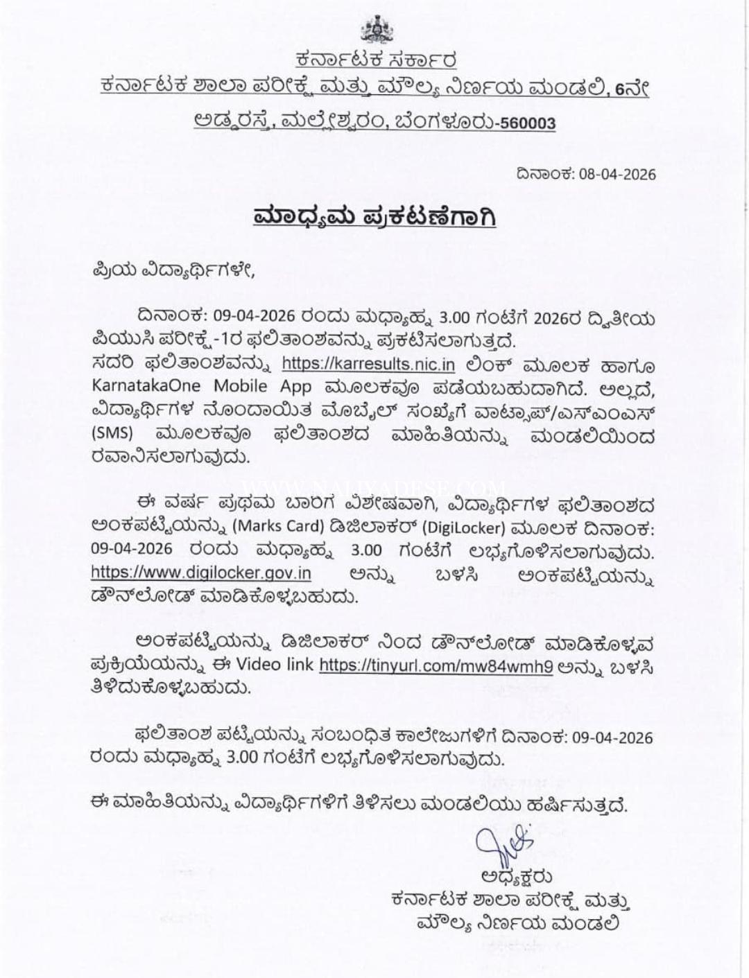 ವಿದ್ಯಾರ್ಥಿಗಳು ತಮ್ಮ ಅಂಕಪಟ್ಟಿಯನ್ನು DigiLocker (https://www.digilocker.gov.in) ಮೂಲಕ ಡಿಜಿಟಲ್ ರೂಪದಲ್ಲಿ ಪಡೆಯಬಹುದಾಗಿದೆ. DigiLocker ನಲ್ಲಿ ಅಂಕಪಟ್ಟಿ ಪಡೆಯುವ ವಿಧಾನ ಕುರಿತು ಮಾರ್ಗದರ್ಶನಕ್ಕಾಗಿ ನೀಡಿರುವ ವಿಡಿಯೋ ಲಿಂಕ್ನ್ನು ಬಳಸಿಕೊಳ್ಳಬಹುದು ಎಂದು ಮಂಡಳಿ ತಿಳಿಸಿದೆ.ಈ ಮಾಹಿತಿಯನ್ನು ವಿದ್ಯಾರ್ಥಿಗಳು ಹಾಗೂ ಪೋಷಕರು ಗಮನಿಸಿ ಅಗತ್ಯ ಕ್ರಮಗಳನ್ನು ಕೈಗೊಳ್ಳುವಂತೆ ಮನವಿ ಮಾಡಲಾಗಿದೆ.