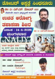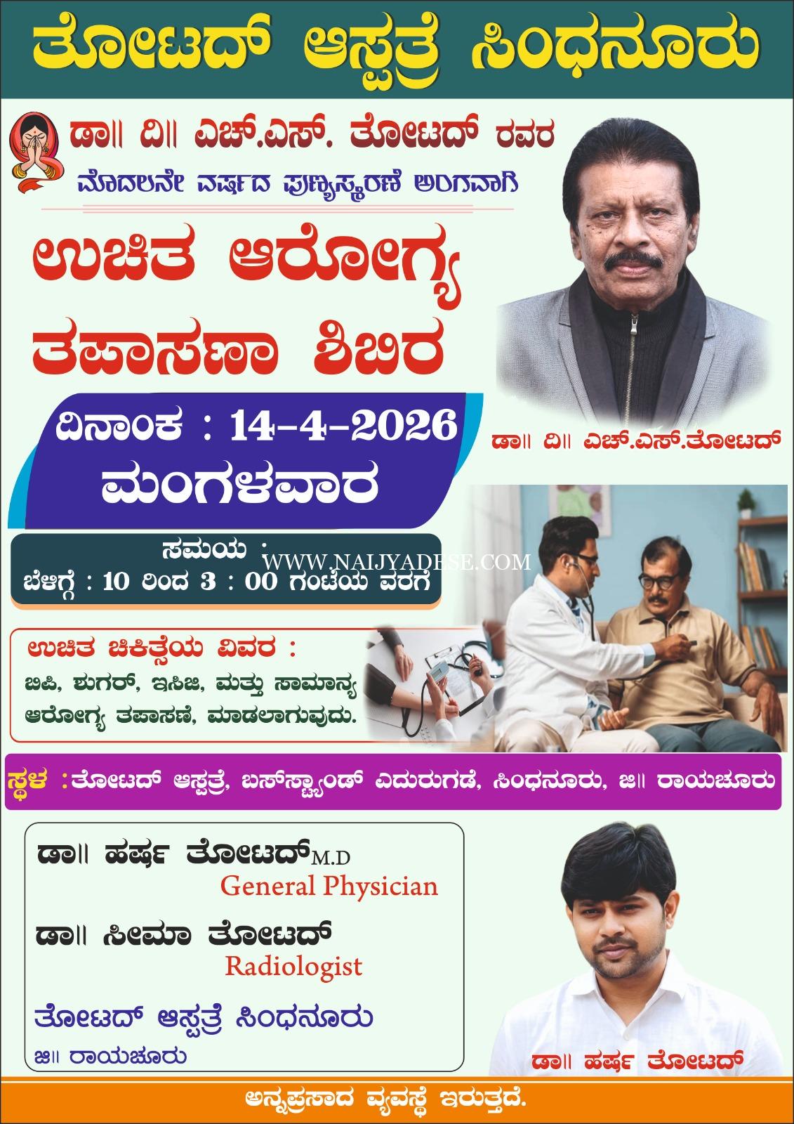 ಸಿಂಧನೂರು : ನಗರದ ತೋಟದ್ ಆಸ್ಪತ್ರೆ ವತಿಯಿಂದ ಡಾ॥ ದಿ॥ ಎಚ್.ಎಸ್. ತೋಟದ್ ರವರ ಮೊದಲನೇ ವರ್ಷದ ಪುಣ್ಯಸ್ಮರಣೆ ಅಂಗವಾಗಿ ಏಪ್ರಿಲ್ 14ರಂದು ಮಂಗಳವಾರ ಉಚಿತ ಆರೋಗ್ಯ ತಪಾಸಣಾ ಶಿಬಿರವನ್ನು ಹಮ್ಮಿಕೊಳ್ಳಲಾಗಿದೆ.
