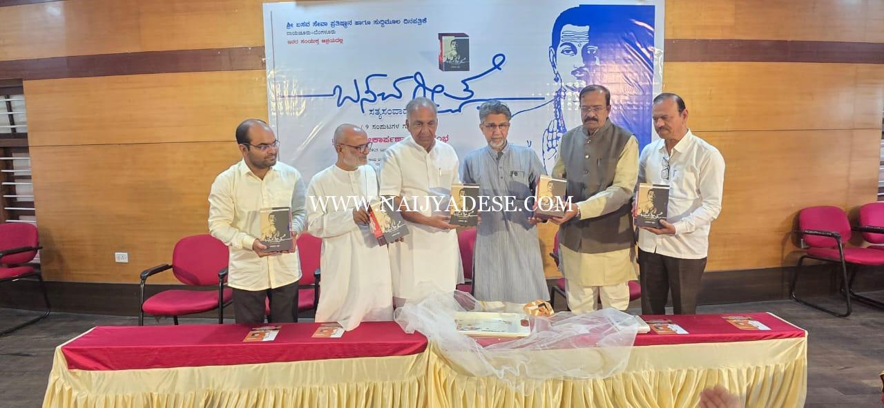 ಬೆಂಗಳೂರು: ಶ್ರೀ ಬಸವ ಸೇವಾ ಪ್ರತಿಷ್ಠಾನ ಹಾಗೂ ಸುದ್ದಿಮೂಲ ದಿನಪತ್ರಿಕೆಯ ಸಂಯುಕ್ತಾಶ್ರಯದಲ್ಲಿ ಬೆಂಗಳೂರಿನ ಗಾಂಧಿ ಭವನದಲ್ಲಿ ಆಯೋಜನೆಗೊಂಡಿದ್ದ ಪುಸ್ತಕ ಬಿಡುಗಡೆ ಸಮಾರಂಭದಲ್ಲಿ, ಸುದ್ದಿಮೂಲ ಪತ್ರಿಕೆಯ ಸಂಪಾದಕರಾದ ಶ್ರೀ ಬಸವರಾಜ ಸ್ವಾಮಿ ಅವರ ಸಂಪಾದಕತ್ವದ 9 ಸಂಪುಟಗಳ ‘ಬಸವಗೀತೆ’ ಪುಸ್ತಕವನ್ನು ಲೋಕಾರ್ಪಣೆ ಗೊಳಿಸಿದ ಸಣ್ಣ ನೀರಾವರಿ ವಿಜ್ಞಾನ ಮತ್ತು ತಂತ್ರಜ್ಞಾನ ಸಚಿವರು ಪರಿಷತ್ತಿನ ಸಭಾ ನಾಯಕರು ಕೊಡಗು ಜಿಲ್ಲಾ ಉಸ್ತುವಾರಿ ಸಚಿವರಾದ ಶ್ರೀ ಎನ್ ಎಸ್ ಬೋಸರಾಜು ಅವರು.