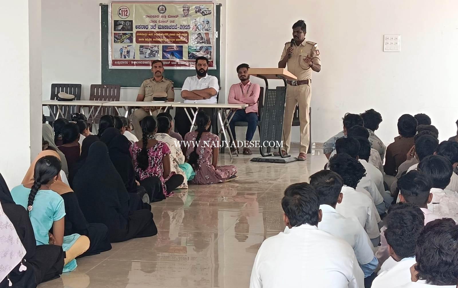 ಮಾನ್ವಿ ಪೊಲೀಸ್ ಠಾಣೆಯ ಪಿಎಸ್ಐ ಅಜ್ಮೀರ್ ಅವರು ಮಾತನಾಡಿ, “ವಿದ್ಯಾರ್ಥಿಗಳು ದುಶ್ಚಟಗಳಿಂದ ದೂರವಿರಬೇಕು. ಯಾವುದೇ ರೀತಿಯ ಕೆಟ್ಟ ಚಟುವಟಿಕೆಗಳಿಗೆ ಬಲಿಯಾಗದೆ, ಉತ್ತಮ ಪ್ರಜೆಗಳಾಗಿ ರೂಪುಗೊಳ್ಳಬೇಕು. ಸಾರ್ವಜನಿಕರು ಹಾಗೂ ವಿದ್ಯಾರ್ಥಿಗಳು ಕಾನೂನನ್ನು ಗೌರವಿಸಬೇಕು ಮತ್ತು ಕಾನೂನು ಸುವ್ಯವಸ್ಥೆಯನ್ನು ಕಾಪಾಡಲು ಪೊಲೀಸರಿಗೆ ಸಹಕಾರ ನೀಡಬೇಕು. ಸೈಬರ್ ಅಪರಾಧಗಳ ಬಗ್ಗೆ ವಿದ್ಯಾರ್ಥಿಗಳು ಜಾಗರೂಕರಾಗಿರಬೇಕು” ಎಂದು ಸಲಹೆ ನೀಡಿದರು.