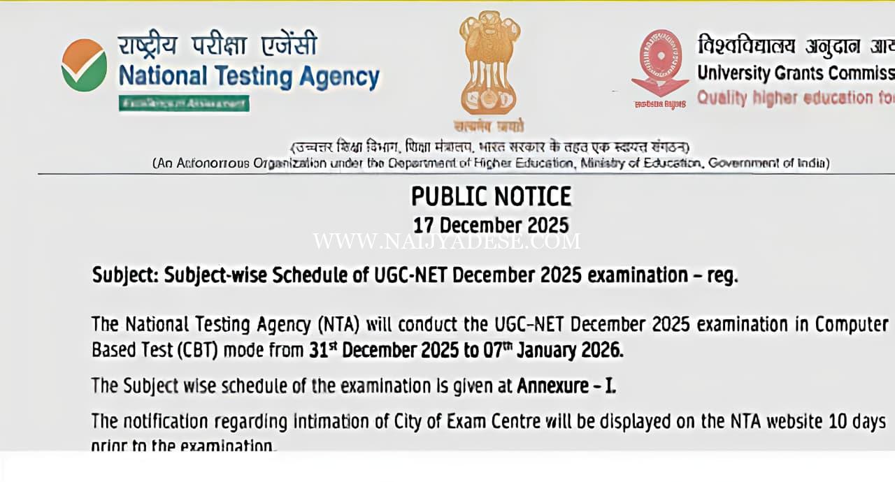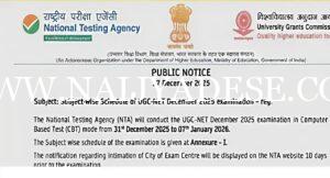 NTA ಯ ಇತ್ತೀಚಿನ ವೇಳಾಪಟ್ಟಿಯ ಪ್ರಕಾರ, UGC NET ಡಿಸೆಂಬರ್ 2025 ಪರೀಕ್ಷೆಗಳು ಡಿಸೆಂಬರ್ 31 ರಿಂದ ಜನವರಿ 7 ರವರೆಗೆ ಆನ್ಲೈನ್ನಲ್ಲಿ ನಡೆಯಲಿವೆ. ಈ ಪರೀಕ್ಷೆಗಳನ್ನು ಒಟ್ಟು 85 ವಿಷಯಗಳಿಗೆ ನಡೆಸಲಾಗುವುದು. ಈ ಪರೀಕ್ಷೆಯನ್ನು ವರ್ಷಕ್ಕೆ ಎರಡು ಬಾರಿ ನಡೆಸಲಾಗುತ್ತದೆ.