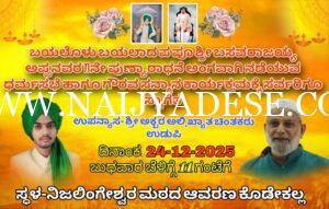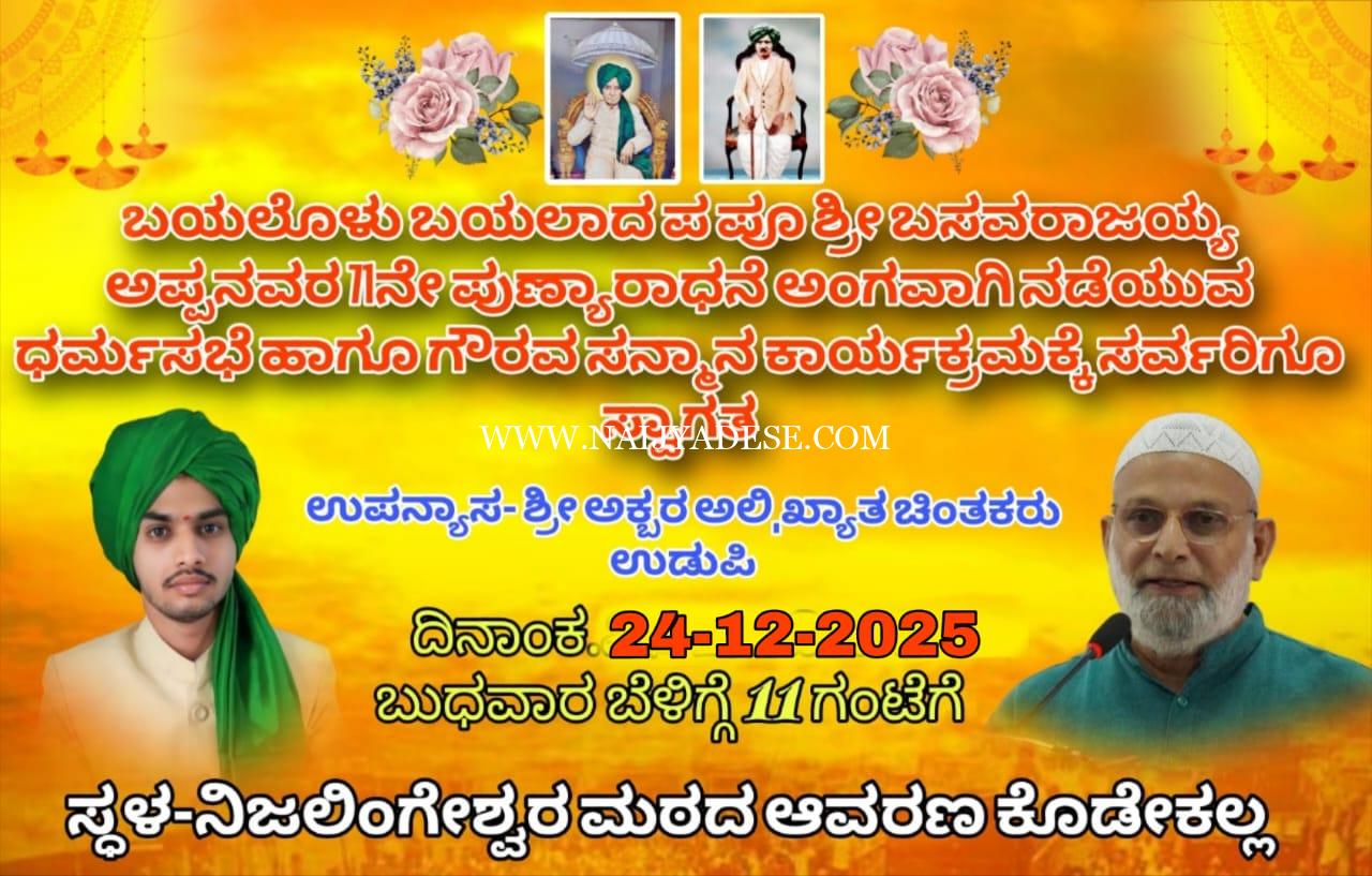 ಕೊಡೇಕಲ್ಲ: ನಾಡಿನಲ್ಲಿ ಸೌಹಾರ್ದತೆ ಸಹಬಾಳ್ವೆ ಹಾಗೂ ಸಮಾನತೆಗೆ ಹೆಸರುವಾಸಿ ಆದಂತಹ ಪರಮಪೂಜ್ಯ ಶ್ರೀ ಬಸವರಾಜಯ್ಯ ಅಪ್ಪನವರ 11ನೇ ಪುಣ್ಯಾರಾಧನೆ ಅಂಗವಾಗಿ ಇಂದು ದಿನಾಂಕ 24 12 2025 ಬುಧವಾರ ಬೆಳಿಗ್ಗೆ 11 ಗಂಟೆಗೆ ಶ್ರೀ ನಿಜಲಿಂಗೇಶ್ವರ ಮಠದ ಆವರಣದಲ್ಲಿ ಧರ್ಮಸಭೆ ಹಾಗೂ ಗೌರವ ಸನ್ಮಾನ ಕಾರ್ಯಕ್ರಮವನ್ನು ಹಮ್ಮಿಕೊಳ್ಳಲಾಗಿದೆ. ಈ ಕಾರ್ಯಕ್ರಮದಲ್ಲಿ ನಾಡಿನ ಖ್ಯಾತ ಚಿಂತಕರಾದ ಶ್ರೀ ಅಕ್ಬರ್ ಅಲಿ ಉಡುಪಿ ರವರು ವಿಶೇಷ ಉಪನ್ಯಾಸವನ್ನು ನೀಡಲಿದ್ದಾರೆ . ಕೊಡೆಕಲ್ ಹಾಗೂ ಸುತ್ತಮುತ್ತಲಿನ ಗ್ರಾಮದ ಗ್ರಾಮಸ್ಥರು ಇದರ ಸದುಪಯೋಗವನ್ನು ಪಡೆದುಕೊಳ್ಳಬೇಕಾಗಿ ಈ ಮೂಲಕ ಪ್ರಕಟಣೆಯಲ್ಲಿ ತಿಳಿಸಲಾಗಿದೆ.
