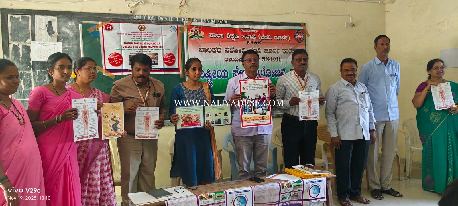 ಜಿಲ್ಲಾಡಳಿತ, ಜಿಲ್ಲಾ ಪಂಚಾಯತ, ಜಿಲ್ಲಾ ಆರೋಗ್ಯ ಮತ್ತು ಕುಟುಂಬ ಕಲ್ಯಾಣ ಇಲಾಖೆ, ಪದವಿಪೂರ್ವ ಶಿಕ್ಷಣ ಇಲಾಖೆ, ಜಿಲ್ಲಾ ತಂಬಾಕು ನಿಯಂತ್ರಣ ಕೋಶ ರವರ ಸಹಯೋಗದಲ್ಲಿ ರಾಯಚೂರು ನಗರದ ಬಾಲಕರ ಸರ್ಕಾರಿ ಪದವಿಪೂರ್ವ ಕಾಲೇಜಿನಲ್ಲಿ ತಂಬಾಕು ಮುಕ್ತ ಯುವ ಅಭಿಯಾನ 3.0 ಅಡಿಯಲ್ಲಿ ನವೆಂಬರ್ 19ರಂದು ಹಮ್ಮಿಕೊಂಡ ಜಾಗೃತಿ ಕಾರ್ಯಕ್ರಮದಲ್ಲಿ ಅವರು ಮಾತನಾಡಿ, ತಂಬಾಕು ಸೇವೆನೆಯು ಗಂಭೀರವಾದ ಆರೋಗ್ಯ ಸಮಸ್ಯೆಗಳಾದ ಕ್ಯಾನ್ಸರ್, ಹೃದಯ ರೋಗ, ಶ್ವಾಸಕೋಶದ ತೊಂದರೆಗಳು, ಹಲ್ಲಿನ ಸಮಸ್ಯೆಗಳು ಮತ್ತು ಫಲವತ್ತತೆಯ ಸಮಸ್ಯೆಗಳು ಉಂಟಾಗುತ್ತವೆ ಎಂದು ಅವರು ತಿಳಿಸಿದರು.