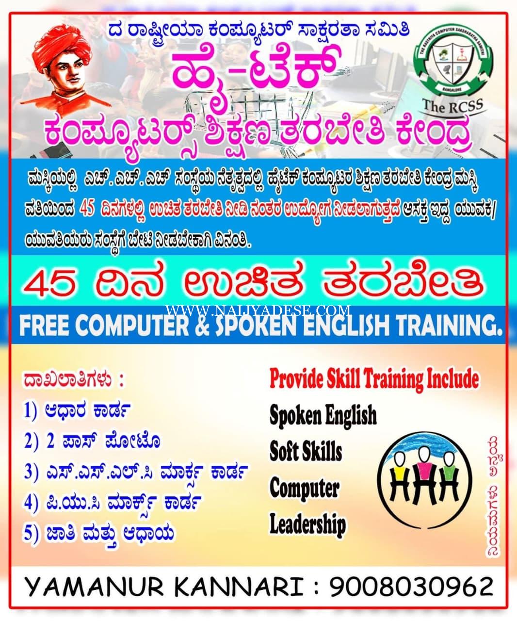 ಮಸ್ಕಿ : ನಗರದ ಹೈಟೆಕ್ ಕಂಪ್ಯೂಟರ್ ಶಿಕ್ಷಣ ತರಬೇತಿ ಕೇಂದ್ರದಲ್ಲಿ 45 ದಿನಗಳಲ್ಲಿ ಉಚಿತವಾಗಿ ಕಂಪ್ಯೂಟರ್, ಸ್ಪೋಕನ್ ಇಂಗ್ಲಿಷ್ ಮತ್ತು ಸಾಪ್ಟ್ ಸ್ಕಿಲ್ ತರಬೇತಿ ನೀಡಿ ನಂತರ ಉದ್ಯೋಗ ನೀಡಲಾಗುವುದು, ಆಸಕ್ತಿ ಇದ್ದ ಯುವಕ/ಯುವತಿಯರು ಸಂಸ್ಥೆಗೆ ಭೇಟಿ ನೀಡಬೇಕಾಗಿ ವಿನಂತಿ.