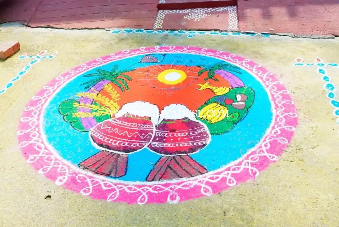 ಮಹಿಳೆಯರು ಬೆಳಗಿನ ಜಾವ ಮನೆಯಂಗಳ ಸ್ವಚ್ಛಗೊಳಿಸಿ ಸಗಣಿಯಿಂದ ಸಾರಿಸಿ ಅಂದವಾದ ರಂಗೋಲಿಯ ಚಿತ್ತಾರ ಮೂಡಿಸಿದರು. ಕೆಲವರು ಚುಕ್ಕಿ ರಂಗೋಲಿ ಇಟ್ಟರೆ, ಕೆಲವರು ಬಣ್ಣದ ರಂಗೋಲಿ ಪುಡಿ ಬಳಿಸಿ ಕಬ್ಬು ಬೆಲ್ಲ, ಎತ್ತುಗಳು ಹಾಗೂ ರೈತನ ಚಿತ್ರ ಬಿಡಿಸಿ ನೋಡುಗರ ಗಮನ ಸೆಳೆಯುವಂತೆ ಮಾಡಿದರು.