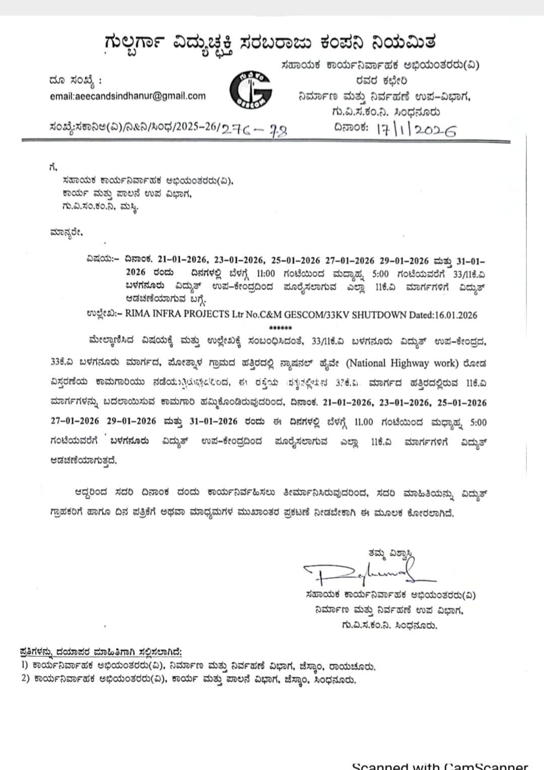 ಬಳಗಾನೂರು :21 ಜ 110 /33 ಕೆವಿ ವಲ್ಕಂದಿನ್ನಿ (ಪೋತ್ನಾಳ) ಸ್ಟೇಷನ್ ನಿಂದ ಬರುವ 33 Kv ಮೇನ್ ಲೈನ್ ಬಳಗಾನೂರು ಮಾರ್ಗದ, ಪೋತ್ನಾಳ ಗ್ರಾಮದ ಹತ್ತಿರ ನ್ಯಾಷನಲ್ ಹೈವೇ (National Highway Work) ರೋಡ ವಿಸ್ತರಣೆಯ ಕಾಮಗಾರಿಯ ಕೆಲಸ ಇರುವ ಕಾರಣ ದಿನಾಂಕ :- 21/01/2026, 23/01/2026, 25/01/2026, 27/01/2026, 29/01/2026,31/01/2026 ರಂದು,ಅಂದಾಜು ಬೆಳಿಗ್ಗೆ 11 :00 ಗಂಟೆಯಿಂದ ಸಾಯಂಕಾಲ 5 ಗಂಟೆಯವರೆಗೆ ವಿದ್ಯುತ್ ವ್ಯತ್ಯಯವಾಗಲಿದೆ. ಪಂಪ್ ಸೆಟ್ ಲೈನ್ ಬೆಳಿಗ್ಗೆ 4:00 ಗಂಟೆಯಿಂದ 11:00 ಗಂಟೆವರೆಗೆ ಕೊಡಲಾಗುವುದು. ದಯವಿಟ್ಟು ವಿದ್ಯುತ್ ಗ್ರಾಹಕರು ಸಹಕರಿಸಬೇಕಾಗಿ ವಿನಂತಿ