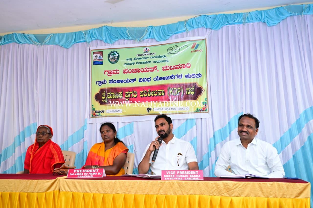 ರಾಯಚೂರು ಜನವರಿ 24 (ಕರ್ನಾಟಕ ವಾರ್ತೆ): ತಾಲೂಕಿನ ಮಟಮಾರಿ ಗ್ರಾಮ ಪಂಚಾಯತ್ ವತಿಯಿಂದ ಮಟಮಾರಿ ಗ್ರಾಮದಲ್ಲಿ ಜನವರಿ 23ರ ಶುಕ್ರವಾರ ದಂದು ಗ್ರಾಮ ಪಂಚಾಯತ್ ವಿವಿಧ ಯೋಜನೆಗಳ ಕುರಿತು ತ್ರೈಮಾಸಿಕ ಪ್ರಗತಿ ಪರಿಶೀಲನಾ (ಕೆಡಿಪಿ) ಸಭೆಯನ್ನು ಯಶಸ್ವಿಯಾಗಿ ನಡೆಸಲಾಯಿತು.