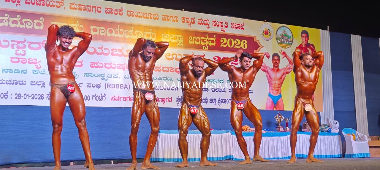 ರಾಯಚೂರು ಜನವರಿ 29 (ಕರ್ನಾಟಕ ವಾರ್ತೆ):ಎಡೆದೊರೆ ನಾಡು ರಾಯಚೂರು ಜಿಲ್ಲಾ ಉತ್ಸವ-2026 ನಿಮತ್ತ ಜನವರಿ 28ರಂದು ರಾಯಚೂರನಲ್ಲಿ ನಡೆದ ರಾಜ್ಯ ಮಟ್ಟದ ಪುರುಷರ ದೇಹದಾರ್ಢ್ಯ ಸ್ಪರ್ಧೆಯಲ್ಲಿ ಬೆಳಗಾವಿ ಜಿಲ್ಲೆಯ ದೇಹದಾರ್ಢ್ಯ ಪಟು ಪ್ರಶಾಂತ ಕನ್ನೂರಕರ ಅವರು ಮಿಸ್ಟರ್ ರಾಯಚೂರು ಉತ್ಸವ-2026ರ ಕಿರೀಟವನ್ನು ಮುಡಿಗೇರಿಸಿಕೊಂಡರು.