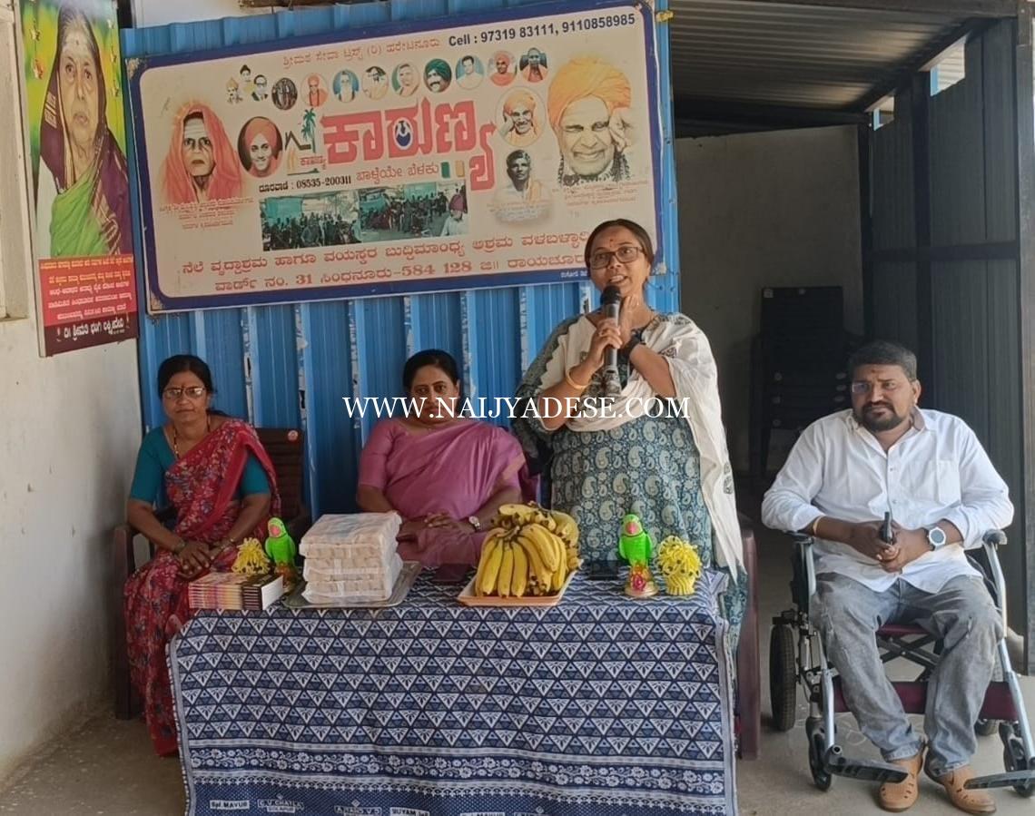 ಸಿಂಧನೂರು — ಕರ್ನಾಟಕ ಪ್ರದೇಶ ಕಾಂಗ್ರೆಸ್ ಸಮಿತಿಯ ಕರ್ನಾಟಕ ಕಟ್ಟಡ ನಿರ್ಮಾಣ ಹಾಗೂ ಕಟ್ಟಿಗೆ ಸಾಮಗ್ರಿಗಳ ಕಾರ್ಮಿಕರ ಫೆಡ್ ರೇಷನ್ ಸಮಿತಿಯ ರಾಜ್ಯ ಮಹಿಳಾ ಅಧ್ಯಕ್ಷರಾದ ಸಂಗೀತಾ ನಾಡಗೌಡ್ರು ಮುದ್ದೇಬಿಹಾಳ ಹಾಗೂ ದಿ. ತಾಳಿಕೋಟಿ ಸಹಕಾರಿ ಬ್ಯಾಂಕ್ ನಿಯಮಿತ ತಾಳಿಕೋಟಿ ಪ್ರಧಾನ ಶಾಖೆಯ ಪ್ರಧಾನ ವ್ಯವಸ್ಥಾಪಕರಾದ ಬಸಮ್ಮ ಕಾಶಿರಾಯ ಮಣ್ಣೂರು ಇವರುಗಳು ಸಿಂಧನೂರು ನಗರದ ಒಳಬಳ್ಳಾರಿ ರಸ್ತೆಯಲ್ಲಿರುವ ಕರ್ನಾಟಕ ಸರ್ಕಾರದ ರಾಜ್ಯ ಪ್ರಶಸ್ತಿ ಪುರಸ್ಕೃತ ಸಂಸ್ಥೆಯಾದ ಶ್ರೀಮಠ ಸೇವಾ ಟ್ರಸ್ಟ್ (ರಿ)ಹರೇಟನೂರು ಕಾರುಣ್ಯ ನೆಲೆ ವೃದ್ಧಾಶ್ರಮ ಹಾಗೂ ವಯಸ್ಕರ ಬುದ್ಧಿಮಾಂಧ್ಯ ಆಶ್ರಮಕ್ಕೆ ಭೇಟಿ ನೀಡಿ ಆಶ್ರಮದಲ್ಲಿನ ಆಶ್ರಯದಾತುರುಗಳಿಗೆ ಹಣ್ಣು ಹಂಪಲುಗಳನ್ನು ವಿತರಿಸಿ ಆತ್ಮಸ್ಥೈರ್ಯ ತುಂಬಿದರು. ಈ ಸಮಯದಲ್ಲಿ ಕಾರುಣ್ಯ ಆಶ್ರಮದ ಸದಸ್ಯರಾದ ಡಾ. ಮಲ್ಲಿಕಾರ್ಜುನ ಸ್ವಾಮಿ ಹಿರೇಮಠ ಕರಡಕಲ್ ಸಾ. ಲಿಂಗಸೂಗೂರು ಇವರನ್ನು ಸನ್ಮಾನಿಸಿ ಗೌರವಿಸಿದರು. ಇದೇ ಸಮಯದಲ್ಲಿ ಸಂಗೀತ ನಾಡಗೌಡ್ರು ಮುದ್ದೇಬಿಹಾಳ ಬಸಮ್ಮ ಕಾ. ಮಣ್ಣೂರು ತಾಳಿಕೋಟಿ ಇವರುಗಳನ್ನು ಆಶ್ರಮದ ವತಿಯಿಂದ ಸನ್ಮಾನಿಸಿ ಗೌರವಿಸಲಾಯಿತು. ನಂತರ ಮಾತನಾಡಿದ ಕೆಪಿಸಿಸಿಯ ಕೆ.ಕೆ.ಎನ್. ಕೆ. ಸಾ. ಕಾ. ಫೇ. ರಾಜ್ಯ ಮಹಿಳಾ ಅಧ್ಯಕ್ಷರಾದ ಸಂಗೀತ ನಾಡಗೌಡ್ರು ಮಾತನಾಡಿ ನಾವುಗಳು ಕಾರುಣ್ಯ ಆಶ್ರಮದ ಬಗ್ಗೆ ಕೇಳುತ್ತಿದ್ದೆವು ಆದರೆ ಇಂದಿನ ವಾಸ್ತವ ಸ್ಥಿತಿ ನೋಡಿದಾಗ ಮಾನವರಾದ ನಾವುಗಳು ನಮಗೆ ಜನ್ಮ ಜೀವ ಜೀವನವನ್ನು ರೂಪಿಸಿ ಕೊಟ್ಟಂತಹ ತಂದೆ ತಾಯಿಗಳನ್ನು ಇಂತಹ ವೃದ್ಧಾಶ್ರಮಕ್ಕೆ ತಳ್ಳುತ್ತಿರುವದು ದುರದೃಷ್ಟಕರ ಸಂಗತಿ. ಈಗಾಗಲೇ ಇಲ್ಲಿನ ಸಿಬ್ಬಂದಿಗಳು ಈ ಆಶ್ರಮವು ಕರ್ಮಭೂಮಿ ಎಂದು ಹೇಳುತ್ತಿರುವ ಅಂಶಗಳನ್ನು ನಾನು ಅರಿತು ಕೊಂಡಾಗ ಕಾರುಣ್ಯಾಶ್ರಮವು ಕರ್ಮಭೂಮಿಯಲ್ಲ ಪುಣ್ಯಕ್ಷೇತ್ರವಿದು ಎಂದೆನಿಸಿದೆ. ಸಿಂಧನೂರಿನ ಕಾರುಣ್ಯಾಶ್ರಮವು ಪುಣ್ಯಕ್ಷೇತ್ರವಾಗಿ ಮಾನವೀಯತೆಯ ಮಂದಿರವಾಗಿದೆ. ಇಂತಹ ಮಂದಿರಕ್ಕೆ ಸಹಾಯ ಸಹಕಾರ ಮಾಡುವ ದಾನಿಗಳೇ ನಿಜವಾದ ಭಕ್ತರುಗಳು ನಾನು ನನ್ನದು ಎನ್ನುವ ಈ ಸ್ವಾರ್ಥ ಪ್ರಪಂಚದಲ್ಲಿ ನಿಸ್ವಾರ್ಥತೆಯ ಬದುಕನ್ನು ಕಟ್ಟಿಕೊಂಡು ರಾಜ್ಯಕ್ಕೆ ಮಾದರಿಯಾಗಿ ಪ್ರಾಮಾಣಿಕವಾಗಿ ಸೇವೆ ಮಾಡುತ್ತಿರುವ ಕಾರುಣ್ಯಾಶ್ರಮಕ್ಕೆ ಮುಂದಿನ ದಿನಮಾನಗಳಲ್ಲಿ ನಮ್ಮ ಕುಟುಂಬದಿಂದ ಹಾಗೂ ಸರ್ಕಾರದ ವ್ಯವಸ್ಥೆಯಲ್ಲಿ ಸೌಲಭ್ಯಗಳನ್ನು ಕೊಡಿಸಲು ಪ್ರಾಮಾಣಿಕ ಪ್ರಯತ್ನ ಮಾಡುತ್ತೇನೆ ಎಂದು ಮಾತನಾಡಿದರು. ನಂತರ ದಿ. ತಾಳಿಕೋಟಿ ಸಹಕಾರ ಬ್ಯಾಂಕ್ ನಿಯಮಿತ ತಾಳಿಕೋಟೆಯ ಪ್ರಧಾನ ಶಾಖೆಯ ಪ್ರಧಾನ ವ್ಯವಸ್ಥಾಪಕರಾದ ಬಸಮ್ಮ ಮಣ್ಣೂರು ಮಾತನಾಡಿ ಹುಟ್ಟು ಸಾವಿನ ಮಧ್ಯೆ ಮಾನವನ ಮಾನವೀಯತೆ ಪಾಠಶಾಲೆಯಾಗಿ ಕಾರುಣ್ಯಾಶ್ರಮವು ಮಾನವ ಧರ್ಮದ ಮಾನವೀಯತೆಯನ್ನು ಸಮಾಜಕ್ಕೆ ತೋರಿಸಿಕೊಟ್ಟಿದೆ. ಈ ನಮ್ಮ ಕಾರುಣ್ಯ ಕುಟುಂಬವು ಬರೀ ಅನಾಥಾಶ್ರಮ ನಡೆಸುವುದಲ್ಲದೆ ಜನರಲ್ಲಿ ಹೆತ್ತವರ ಬಗ್ಗೆ ಹಿರಿಯರ ಬಗ್ಗೆ ಹಲವಾರು ಅಭಿಮಾನಗಳನ್ನು ಹಮ್ಮಿಕೊಳ್ಳುವ ಮೂಲಕ ಸಮಾಜವನ್ನು ಶುದ್ಧೀಕರಣ ಮಾಡುವ ಕಾರ್ಯ ಮಾಡುತ್ತಿರುವುದು ನಮಗೆ ಸಂತೋಷವನ್ನುಂಟು ಮಾಡಿದೆ ಎಂದು ಮಾತನಾಡಿದರು. ಈ ಕಾರ್ಯಕ್ರಮದಲ್ಲಿ ಡಾ. ಮಲ್ಲಿಕಾರ್ಜುನ ಸ್ವಾಮಿ ಹಿರೇಮಠ ಹಿರೇಮಠ ಸದಸ್ಯರು ಶ್ರೀ ಮಠ ಸೇವಾ ಟ್ರಸ್ಟ್ ಕಾರುಣ್ಯ ಆಶ್ರಮ ಸಿಂಧನೂರು.. ಶರಣಪ್ಪ ನಾಯಕ ಕಸಬಾ ಲಿಂಗಸೂಗೂರು. ಸ