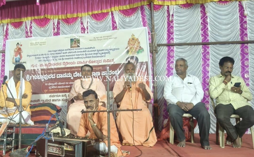 ತಾಲೂಕಿನ ನಾವದಗಿ ಗ್ರಾಮ ಬ್ರಹನ್ಮಠದ ಪೂಜ್ಯ ಷ.ಬ್ರ. ಶ್ರೀ ರಾಜಗುರು ರಾಜೇಂದ್ರ ಒಡೆಯರ್ ರ್ಶಿವಾಚಾರ್ಯ ಮಹಾಸ್ವಾಮಿಗಳ ಗುರು ಪಟ್ಟಾಧಿಕಾರದ ದ್ವಿತೀಯ ವಾರ್ಷಿಕೋತ್ಸವ ನಿಮಿತ್ಯವಾಗಿ ಹಮ್ಮಿಕೊಂಡ ಗುಡ್ಡಾಪುರದ ದಾನಮ್ಮ ದೇವಿ ಪುರಾಣದ 17 ನೇ ದಿನದ ಕಾರ್ಯಕ್ರಮದ ಸಾನಿಧ್ಯ ವಹಿಸಿ ಆಶೀರ್ವಚನ ನೀಡಿದರು. ಶ್ರೀಮಠದ ಪರಮ ಪೂಜ್ಯರು ಈ ಭಾಗದಲ್ಲಿ ಧರ್ಮ ಜಾಗೃತಿ ಮೂಡಿಸುವ ಕಾರ್ಯವನ್ನು ಮಾಡುತ್ತಿದ್ದಾರೆ ಅವರಿಗೆ ನೀವೆಲ್ಲರೂ ತನು-ಮನ ಧನದಿಂದ ಸಹಕಾರ ನೀಡಿ ಎಂದರು.ನಾವದಗಿಯ ಪೂಜ್ಯ ಷ.ಬ್ರ. ಶ್ರೀ ರಾಜ ಗುರುರಾಜೇಂದ್ರ ಒಡೆಯರ್ ಶಿವಾಚಾರ್ಯರು ಸಮ್ಮುಖ ವಹಿಸಿ ಆಶೀರ್ವಚನ ನೀಡಿದರು. ಇದೇ ಸಂದರ್ಭದಲ್ಲಿ ಪ್ರಸಾದ ಸೇವೆ ಗೈದ ತಾಳಿಕೋಟಿ ಪಟ್ಟಣದ ವಿಕೆಎಚ್ ಶಿಕ್ಷಣ ಸಂಸ್ಥೆಯ ಅಧ್ಯಕ್ಷ, ಸಮಾಜ ಸೇವಕ ಪ್ರಹ್ಲಾದಸಿಂಗ್ ಹಜೇರಿ ಇವರನ್ನು ನಾವದಗಿ ಶ್ರೀಗಳು ಶ್ರೀಮಠದ ವತಿಯಿಂದ ಸನ್ಮಾನಿಸಿ ಆಶೀರ್ವಾದ ನೀಡಿದರು. ಕಾರ್ಯಕ್ರಮದಲ್ಲಿ ವೇ.ಮೂ.ಗುರಯ್ಯ ಶಾಸ್ತ್ರಿಗಳು, ಪ್ರಭುಲಿಂಗಯ್ಯ ಹಿರೇಮಠ, ಸಾಹಿತಿ ಬಸವರಾಜ ಗೊರಜಿ,ವಿಠಲ್ ಹಜೇರಿ, ಗ್ರಾಮದ ಗಣ್ಯರು ಹಿರಿಯರು ಹಾಗೂ ಮಹಿಳೆಯರು ಇದ್ದರು.