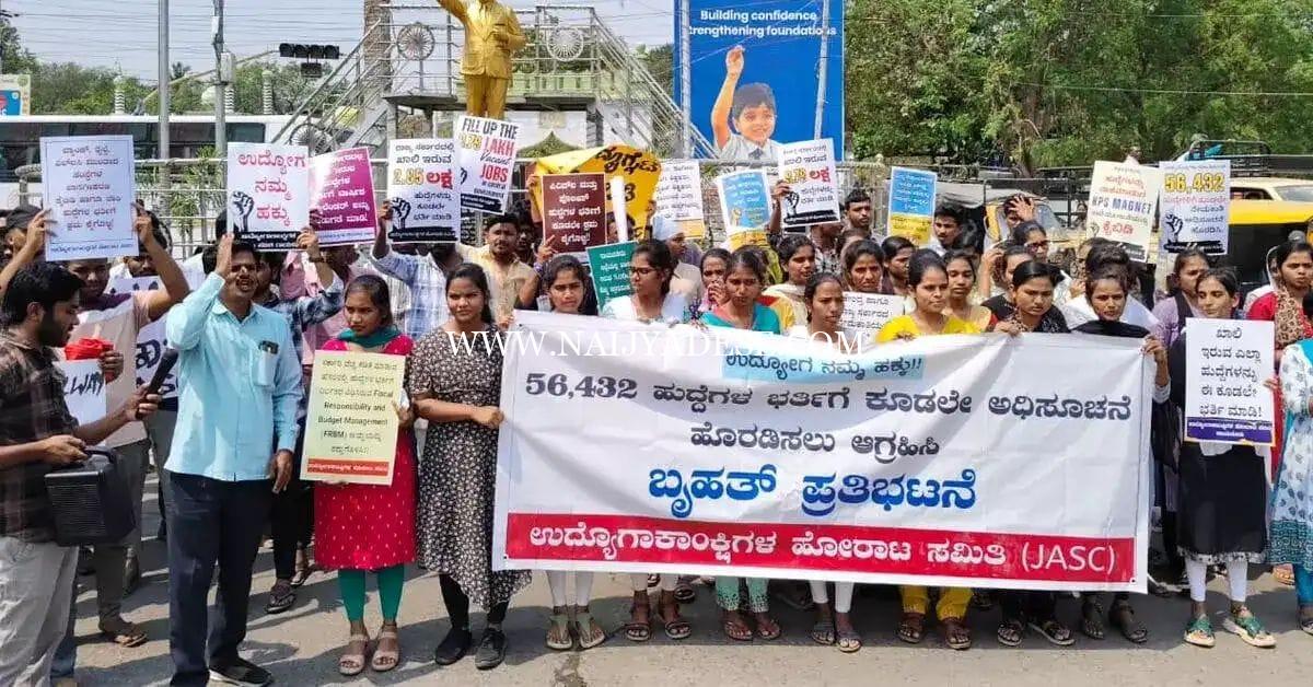 ರಾಯಚೂರು : ರಾಜ್ಯ ಸಚಿವ ಸಂಪುಟ ಅನುಮೋದಿಸಿರುವ 56,432 ಹುದ್ದೆಗಳ ಭರ್ತಿಗೆ ಕೂಡಲೇ ಅಧಿಸೂಚನೆ ಹೊರಡಿಸಬೇಕು ಎಂದು ಒತ್ತಾಯಿಸಿ ಉದ್ಯೋಗಾಕಾಂಕ್ಷಿಗಳ ಹೋರಾಟ ಸಮಿತಿಯಿಂದ ನಗರದ ಡಾ.ಬಿ.ಆರ್ ಅಂಬೇಡ್ಕರ್ ವೃತ್ತದಲ್ಲಿ ಸೋಮವಾರ ಧರಣಿ ನಡೆಯಿತು.ರಾಜ್ಯದಲ್ಲಿ ಖಾಲಿ ಇರುವ 2,84,881 ಹುದ್ದೆಗಳಲ್ಲಿ 56,432 ಹುದ್ದೆಗಳಿಗೆ ಯಾವುದೇ ವಿಳಂಬವಿಲ್ಲದೆ ಅಧಿಸೂಚನೆ ಹೊರಡಿಸಬೇಕು.